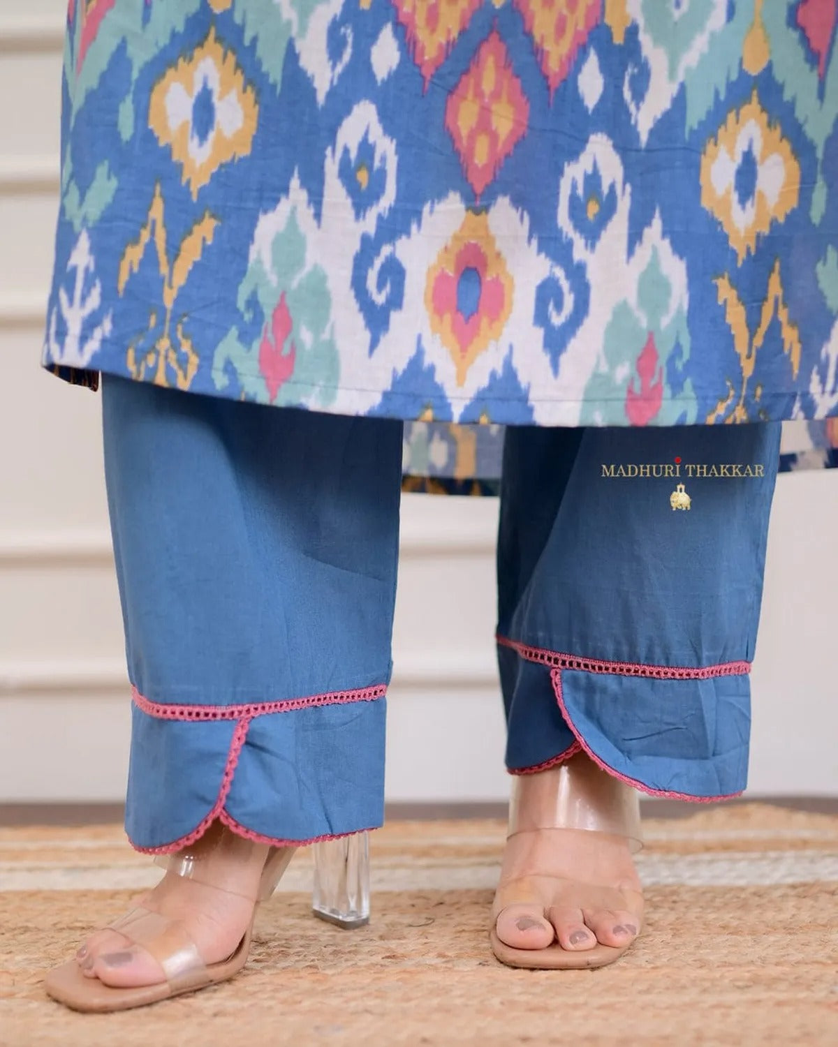 Embrace vibrant elegance with this premium cotton printed designer kurta. Featuring a beautiful blend of Ikat-inspired multicolor patterns on a blue base, the kurta is adorned with intricate pink lace detailing on the neckline and sleeves. The soft cotton fabric ensures all-day comfort, while the tailored fit adds a touch of sophistication. Perfect for casual outings or relaxed gatherings, this kurta is both stylish and breathable—making it a must-have in your wardrobe.
