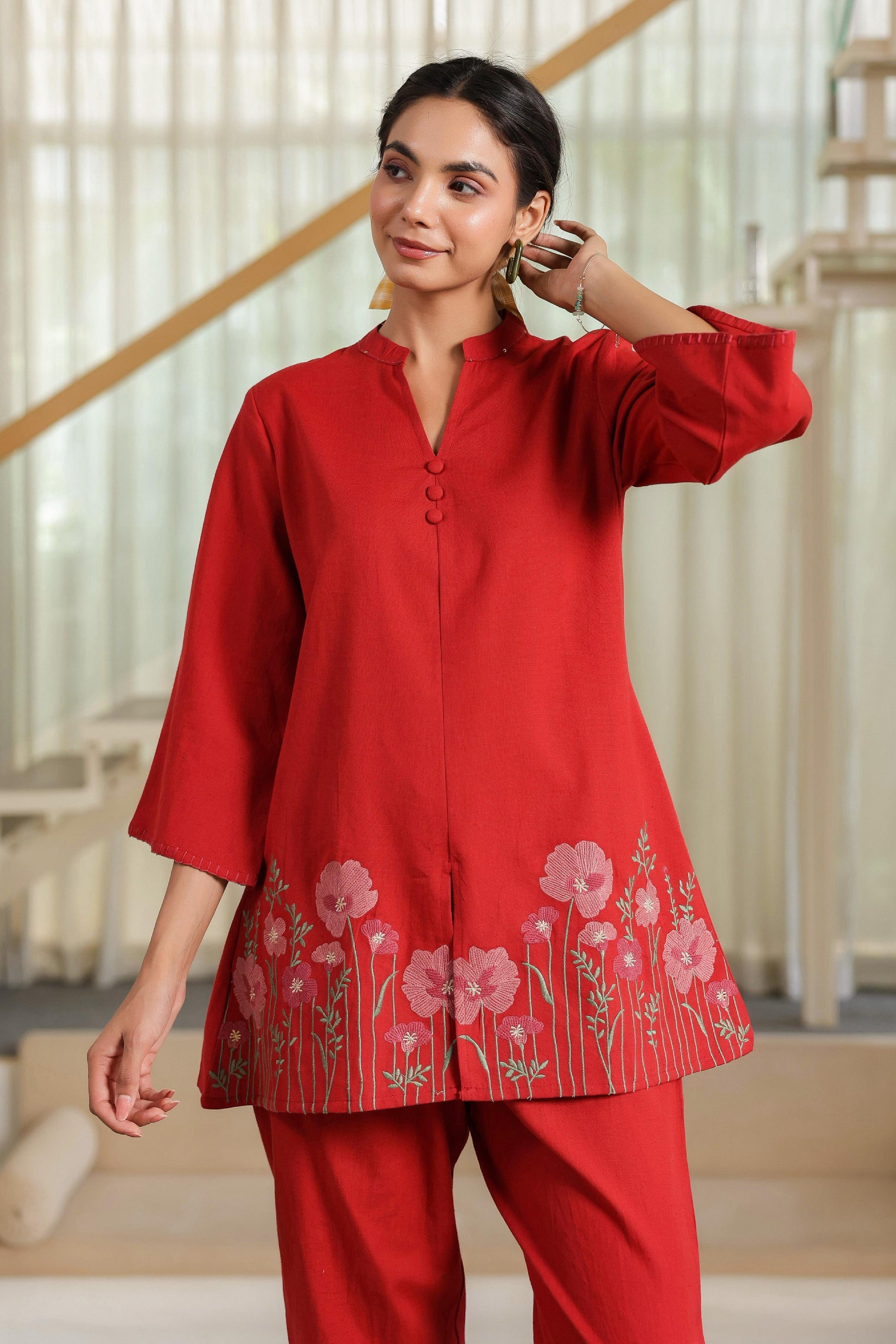 This elegant set features a short kurti paired with comfortable pants, crafted from breathable cotton fabric. The intricate embroidery work adds a refined touch, making it suitable for both casual and semi-formal occasions. Designed for comfort and style, this ensemble offers a perfect blend of traditional craftsmanship and modern wearability